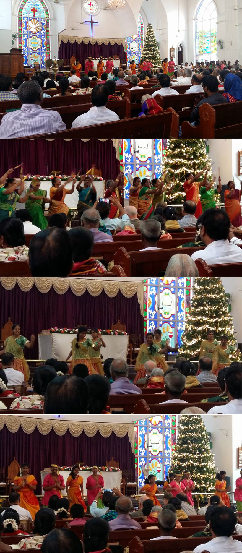 After each Bible reading, performances by the Sunday school kids, the youth and women's fellowship were conducted before the guests, in order to give them a glimpse of our diverse culture. The Sunday school kids dressed as fishermen and fisherwomen did a folk dance and were dressed in colourful costumes. The youth girls danced for a North Indian based song and were beautifully dressed in vibrant colours that showcased the culture of India to the guests. The members of the women's fellowship both young and old, performed kolattam to the tune of a traditional keerthanai.